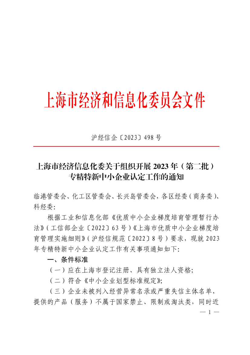 根据工业和信息化部《优质中小企业梯度培育管理暂行办法》(工信部企业〔2022〕63号)《上海市优质中小企业梯度培育管理实施细则》(沪经信规范〔2022〕8号)要求,现就2023年专精特新中小企业认定工作有关事项通知如下: