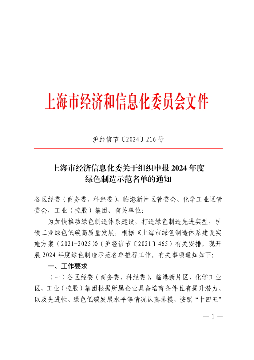 为加快推动绿色制造体系建设,打造绿色制造先进典型,引领工业绿色低碳高质量发展,根据《上海市绿色制造体系建设实施方案(2021-2025)》(沪经信节〔2021〕465)有关安排,现开展2024年度绿色制造示范名单推荐工作。有关事项通知如下: