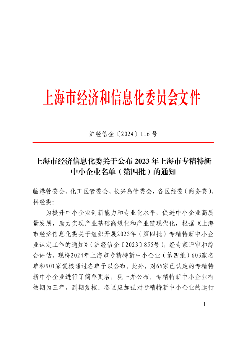 为提升中小企业创新能力和专业化水平,促进中小企业高质量发展,助力实现产业基础高级化和产业链现代化,根据《上海市经济信息化委关于组织开展2023年(第四批)专精特新中小企业认定工作的通知》(沪经信企〔2023〕855号),经专家评审和综合评估,现将2024年上海市专精特新中小企业(第四批)603家名单和901家复核通过名单予以公布。此外,对65家已认定的专精特新中小企业进行了简单更名,现一并公布。专精特新中小企业有效期为三年,到期复核。各区应加强对专精特新中小企业的运行分析,强化精准服务,快速、及时解决企业困难诉求,促进企业高质量发展。